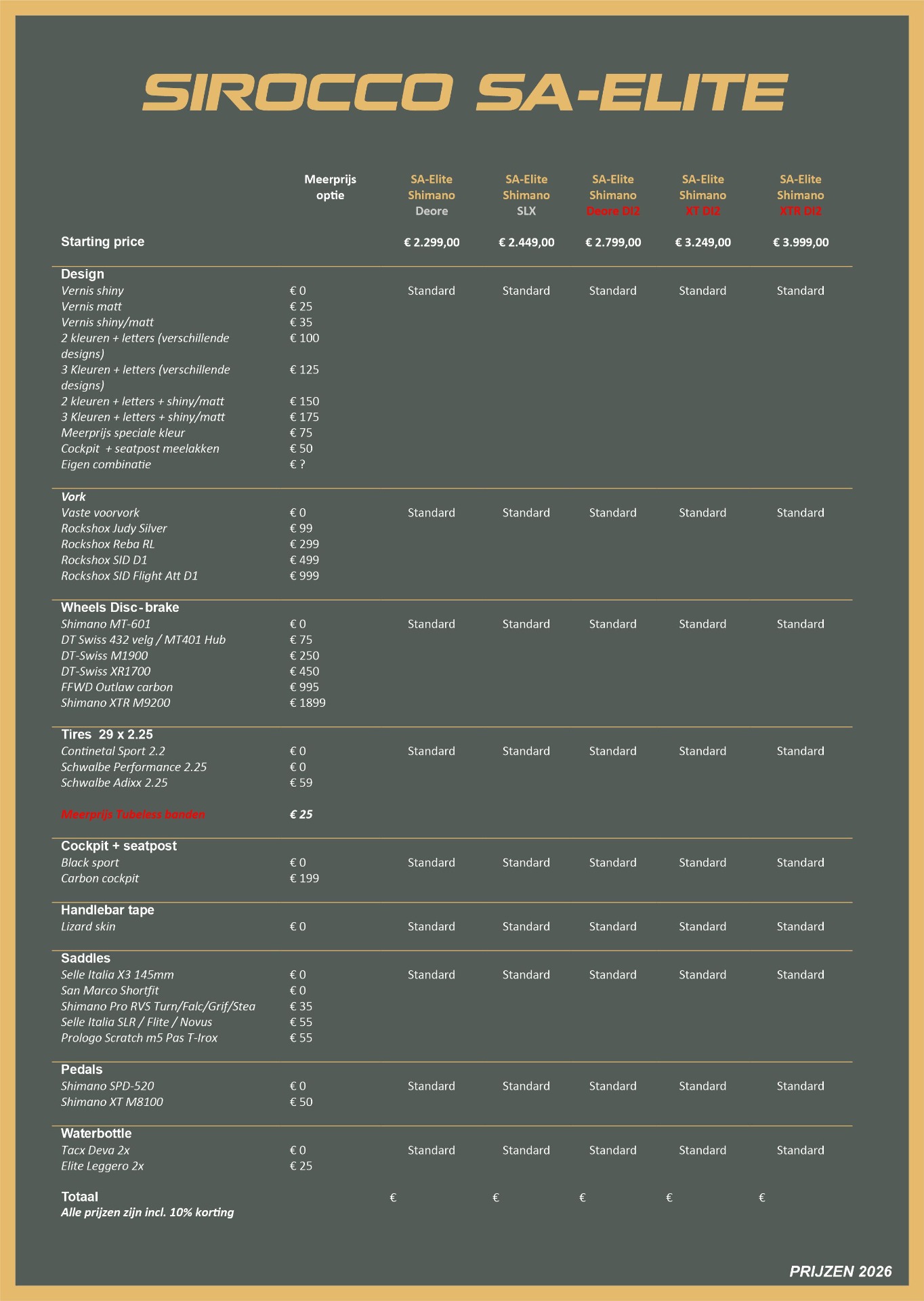 De Sirocco SA-Elite is de ideale mountainbike voor avonturiers met een sterke focus op kwaliteit. Dit model is speciaal ontwikkeld voor fietsliefhebbers die de Brabantse bossen willen verkennen en tegelijkertijd de uitdaging van ruig terrein willen aangaan.