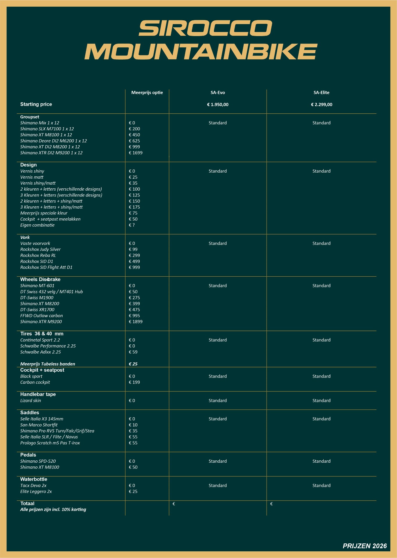 Voor de ervaren mountainbiker hebben wij de Sirocco SA-Elite. Dit model heeft een complete make-over ondergaan, waarbij alle kabels strak in het balhoofd zijn weggewerkt voor een moderne, gestroomlijnde look. Het lichte frame is speciaal ontworpen om topprestaties te leveren op uitdagende bospaden. Bent u op zoek naar het ultieme mountainbike-avontuur? Dan is de SA-Elite de ideale keuze. Voor slechts €300 meer dan de SA-Evo ontvangt u een high-end mountainbike die uw grenzen verlegt.