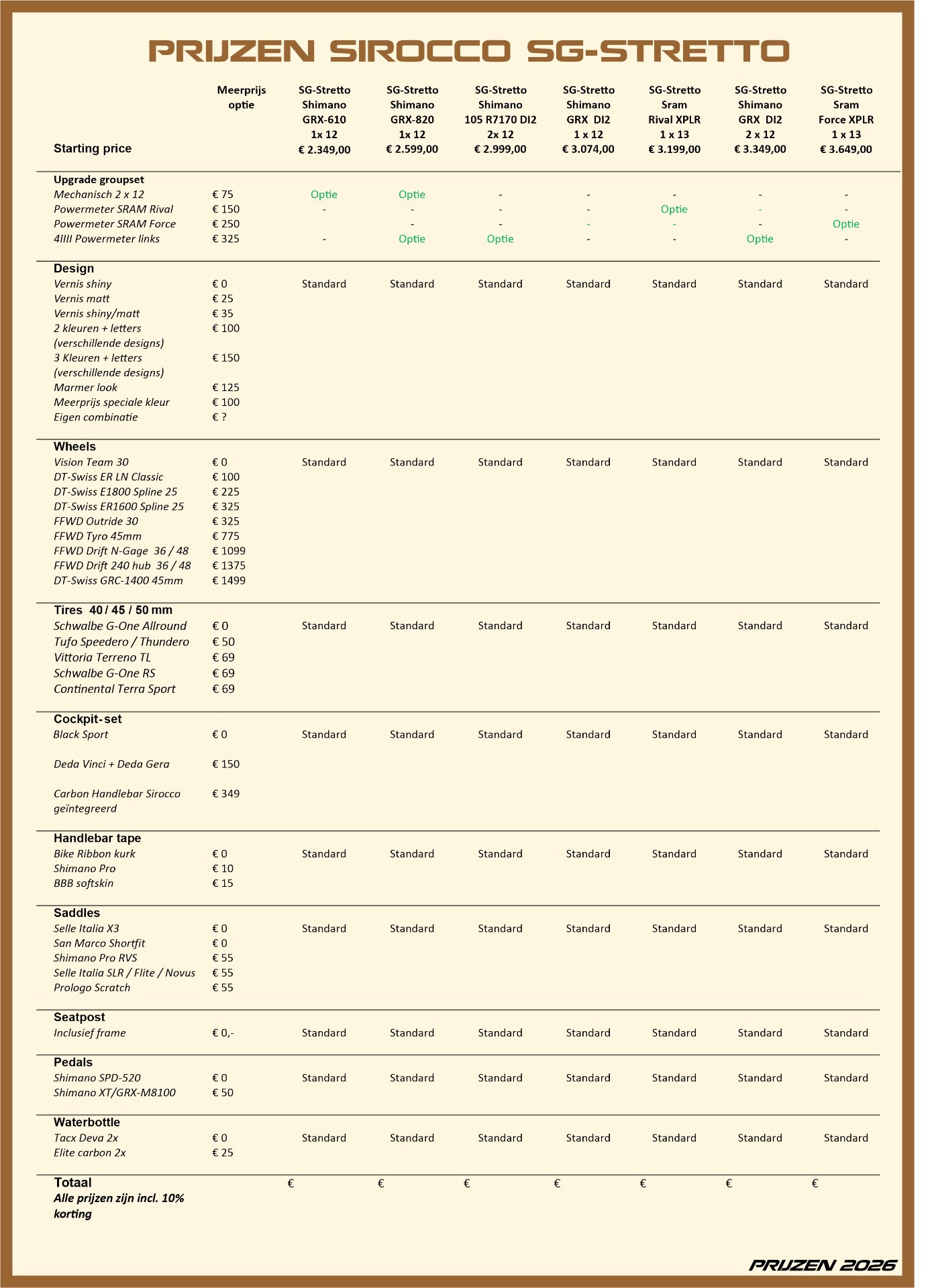 Wij starten altijd met een standaardmontage – dit vormt de basis en tevens de laagste instapprijs. Vanuit daar kunt u uw Sirocco gravel fiets helemaal personaliseren. Wilt u eigen wielen of onderdelen meenemen? Dat kan natuurlijk ook.