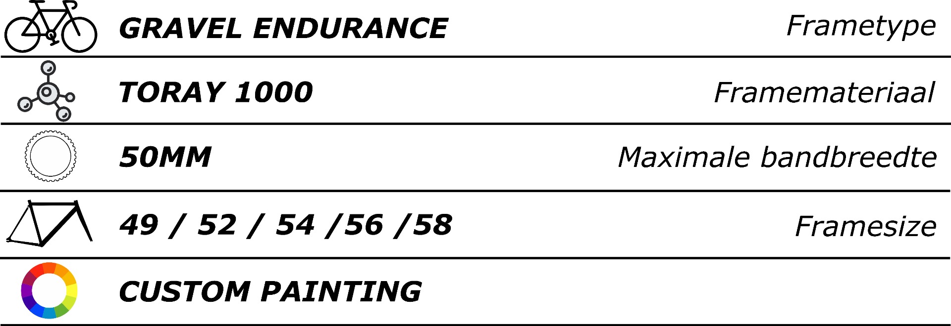 Hieronder vindt u het standaardmodel SG-Carve. Dit model is slechts het begin; alle mogelijkheden kunnen worden aangepast aan uw wensen. U kunt uw eigen design kiezen. Onderaan de pagina staat een PDF-bestand waarmee u alle aanpassingsopties kunt verkennen en de bijbehorende meerprijzen kunt bekijken. Zo weet u precies wat u kunt verwachten en hoe uw droomfiets eruit kan zien.