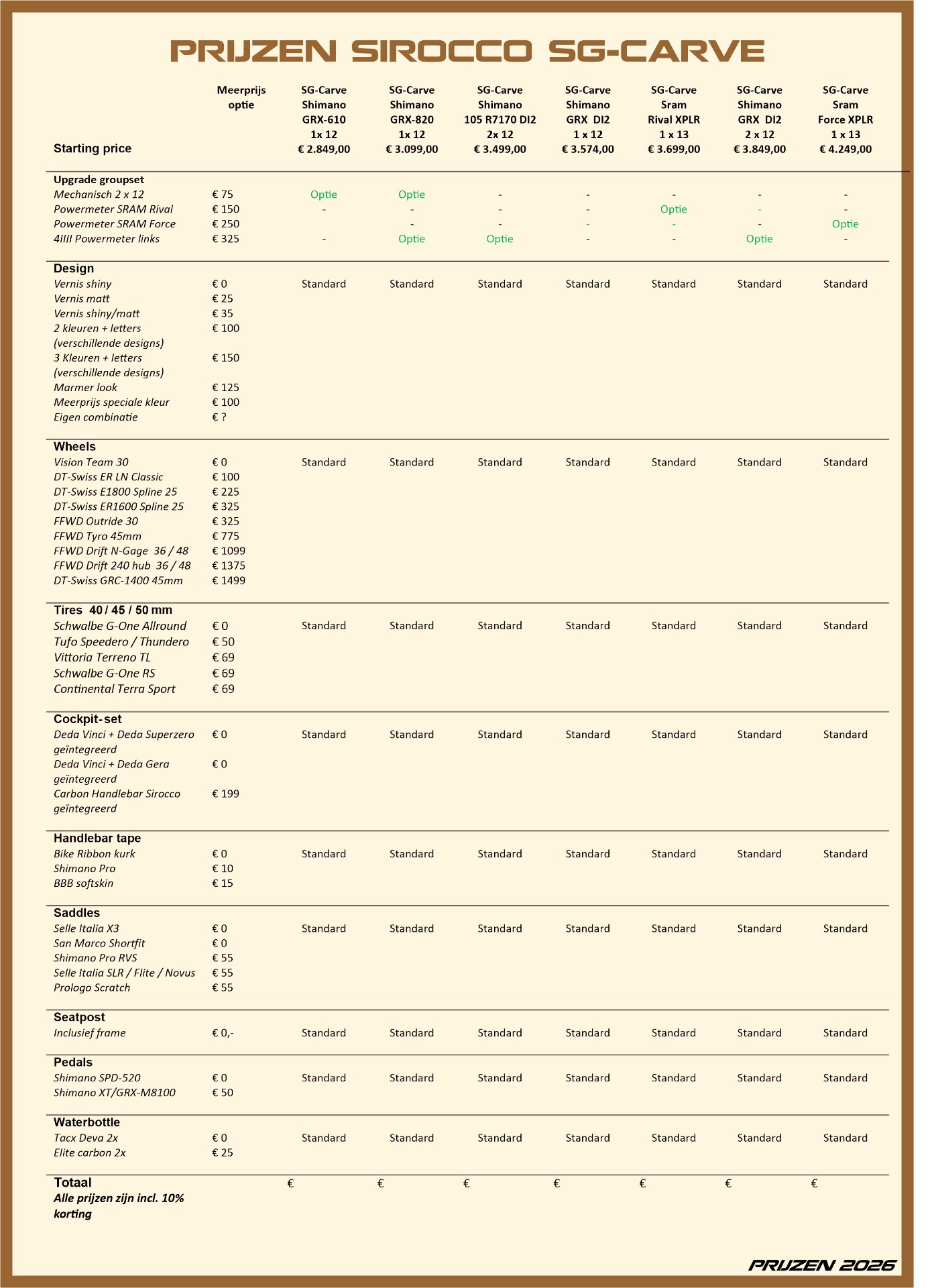 Het grote voordeel van Sirocco is dat wij de prijzen laag houden en daarnaast een groot assortiment aan mogelijkheden bieden. Wij beginnen altijd met een standaardmontage, wat zorgt voor de laagste prijs. Maar we begrijpen dat elke fietser uniek is, dus bieden we u de flexibiliteit om uw fiets te upgraden. Wilt u uw eigen wielen of ander materiaal gebruiken? Dit is voor ons geen probleem.