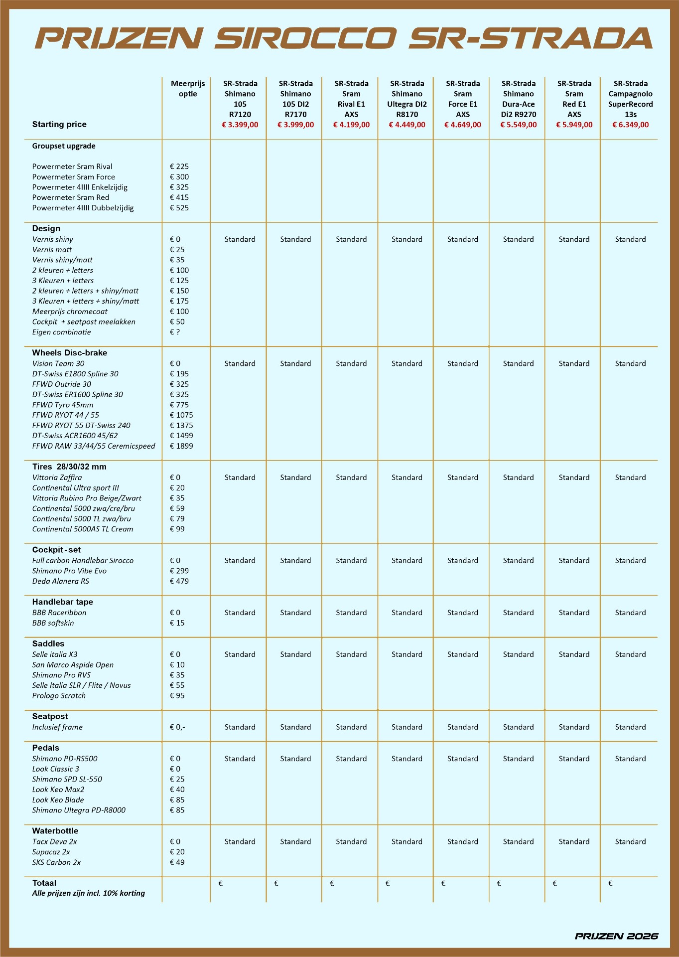 In tegenstelling tot de andere race modellen kunnen er ''maar'' 30mm banden in SR-Strada. Het frame kan gelakt worden naar eigen keuze. Dit geldt ook voor de af montage. Heeft u hiernaast specifieke wensen die niet op de configurator staan? Kom dan gerust langs in onze winkel voor meer informatie.