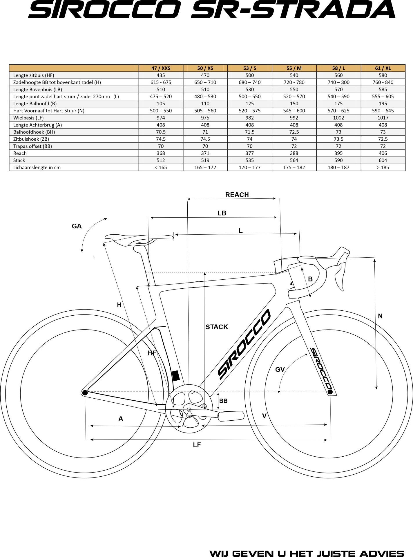 Wanneer de geometrie-waardes geanalyseerd worden, kunt u concluderen dat u alle kanten op kan met dit frame. Het frame heeft normale waardes wat betreft de geometrie en lijkt daarom veel op een traditioneel frame. Maar door de zadelpen en het balhoofdkopje dat in het frame valt, geeft dit weer een strak gevoel. Hierdoor krijgt u het echte aero gevoel op de fiets. Wij maken gebruik van een balhoofd lager van 1 1/2" onder en 1 1/2" boven. De maten van het frame zijn 48/51/54/57/60. De geometrie-waardes kunt u allemaal vinden in onderstaande afbeelding. Het gewicht van het frame is 940gr. ( 54cm) vork 410gr, zadelpen 115gr.